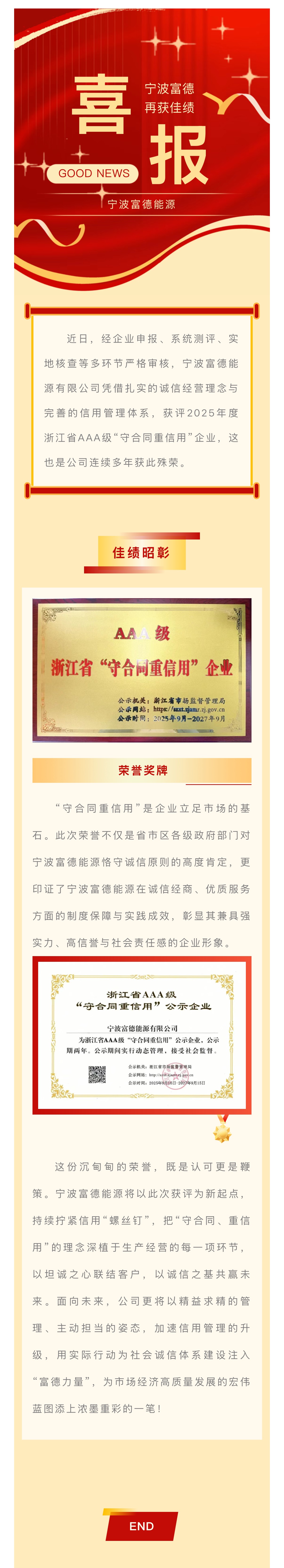 喜报!宁波富德能源蝉联浙江省AAA级“守合同重信用”企业